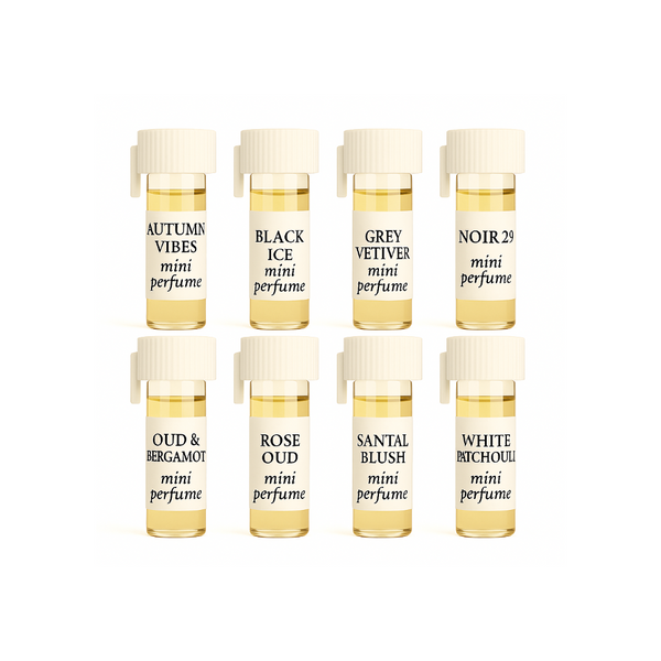 A refined selection of eight woody designer perfumes—Autumn Vibes, Black Ice, Grey Vetiver, Noir 29, Oud & Bergamot, Rose Oud, Santal Blush, and White Patchouli. Each 1/6-dram vial offers a concentrated expression of warmth, texture, and modern sophistication, allowing you to explore the full character of this fragrance family.