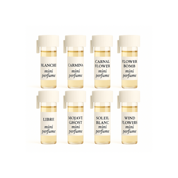 A refined selection of eight floral designer perfumes—Blanche, Carmina, Carnal Flower, Flowerbomb, Libre, Mojave Ghost, Soleil Blanc, and Wind Flowers. Each 1/6-dram vial reveals a unique expression of petal-soft florals, radiant citrus, and airy musks, offering a beautifully rounded introduction to this fragrance family.