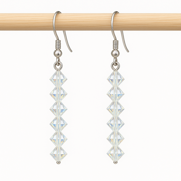 A shimmering composition of Aurora Borealis crystals reflects shifting tones of light, evoking the sparkle of sunlit ocean waves. Each earring measures approximately 2.5 inches and is finished with hypoallergenic earwires for graceful movement and refined luminosity.