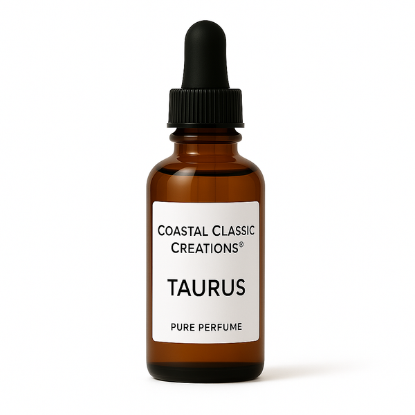 Amber dropper bottle of Taurus Pure Perfume with minimalist label, shown on a white background