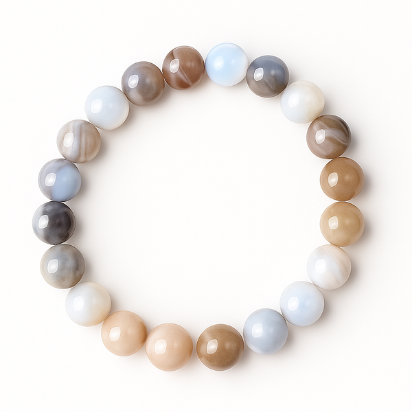 A composition of Natural Agate gemstones reveals layered translucence and subtle tonal variations formed over time. The bracelet feels steady and composed — a graceful reflection of tranquility, balance, and enduring connection to the earth.