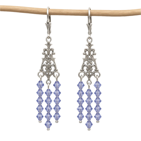 A luminous arrangement of faceted tanzanite-blue crystals cascades from antique-style sterling silver chandelier centerpieces adorned with vines, buds, and a central bloom. Measuring approximately 2.5 inches with sterling silver leverbacks, each handcrafted pair blends boho sophistication with timeless artistry for a design that feels both graceful and distinctive.