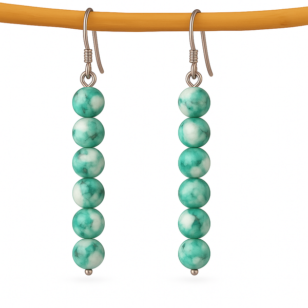 A composition of Ocean Whirl Agate reveals swirling shades of turquoise, teal, and white that echo the rhythm of the tides. Each earring measures approximately 2.25 inches and is finished with hypoallergenic ear wires for balanced movement and serene, natural elegance.