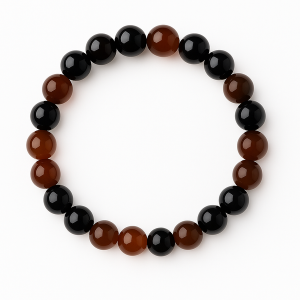 A harmonious composition of Orange and Black Agate gemstones reflects balance and quiet strength through layered tones of deep orange and black. The bracelet feels centered and enduring — a graceful reflection of confidence, protection, and timeless resilience.