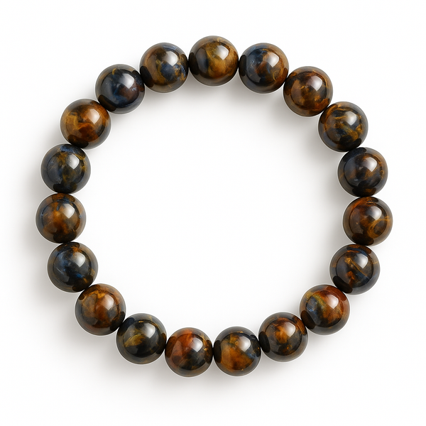 A luminous composition of Pietersite gemstones displays fluid bands of blue, gold, and red that shift with natural light, reflecting movement and transformation. The bracelet feels elevated and introspective — a graceful reflection of authenticity, spirituality, and mindful refinement.