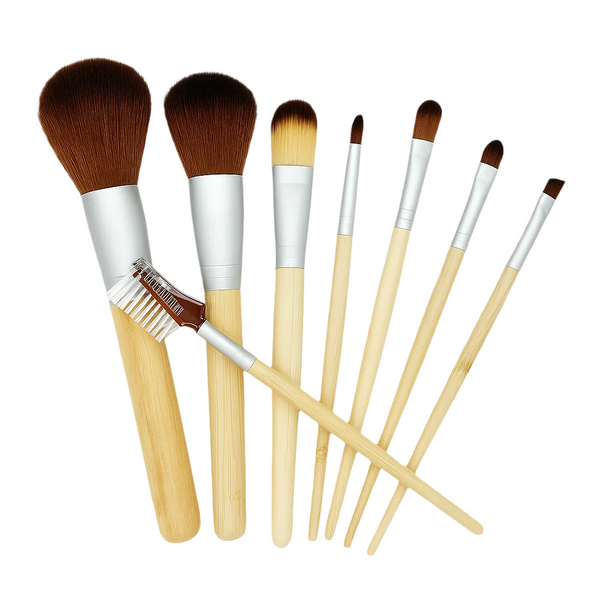 A versatile brush collection crafted with sustainable bamboo handles and soft Taklon bristles for seamless makeup application. Housed in a reusable hemp and cotton pouch, this eco-friendly set offers tools for foundation, powders, eyes, and lips in one refined collection.