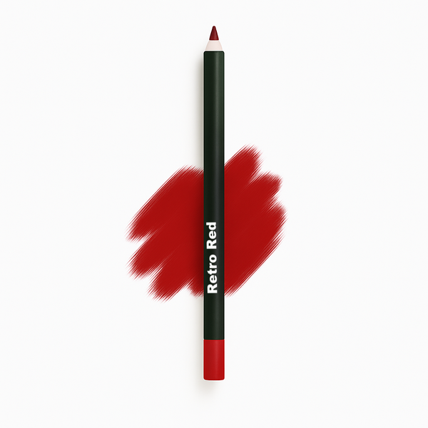 Sharpened Retro Red lip crayon with matte black barrel and red tip, shown with red swatch on a white background