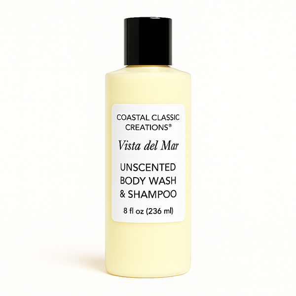 Vista del Mar Unscented Body Wash & Shampoo in pale yellow 8 oz bottle with black cap and white label on white background
