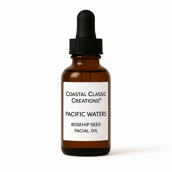Pacific Waters Rosehip Seed Facial Oil in amber dropper bottle with black cap and white label, shown on a pure white background