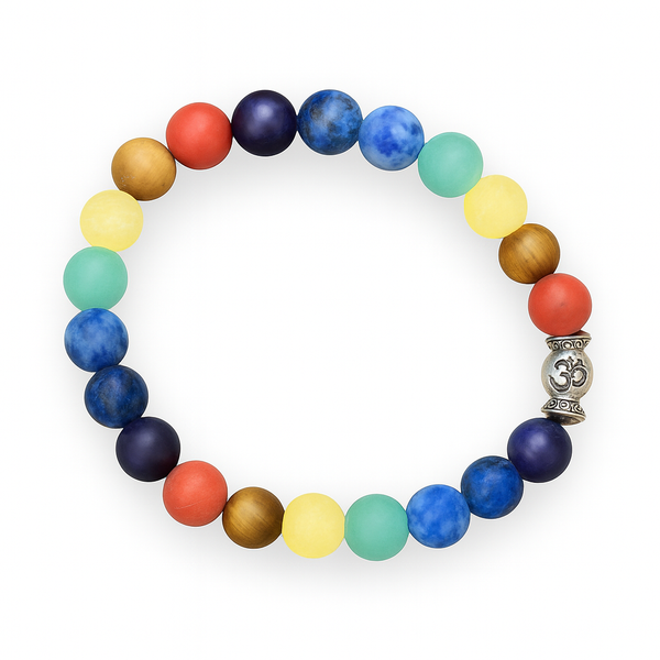 A radiant sequence of gemstones from amethyst to red jasper reflects balance across the seven chakras. Accented with an antique-finish Om bead, it symbolizes unity, awareness, and connection.