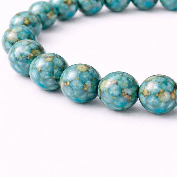 8 mm Turquoise Mosaic Shell gemstones in bronze and turquoise tones with natural mosaic patterning.