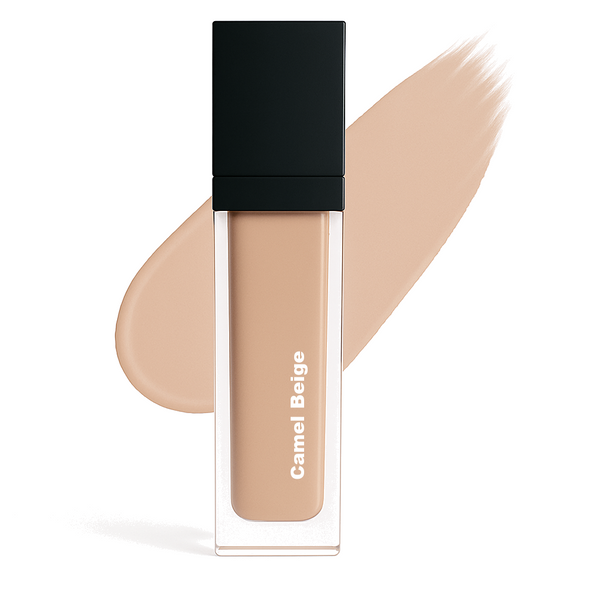 Camel Beige concealer in clear square tube with black cap, shown with soft beige cream swatch on white background